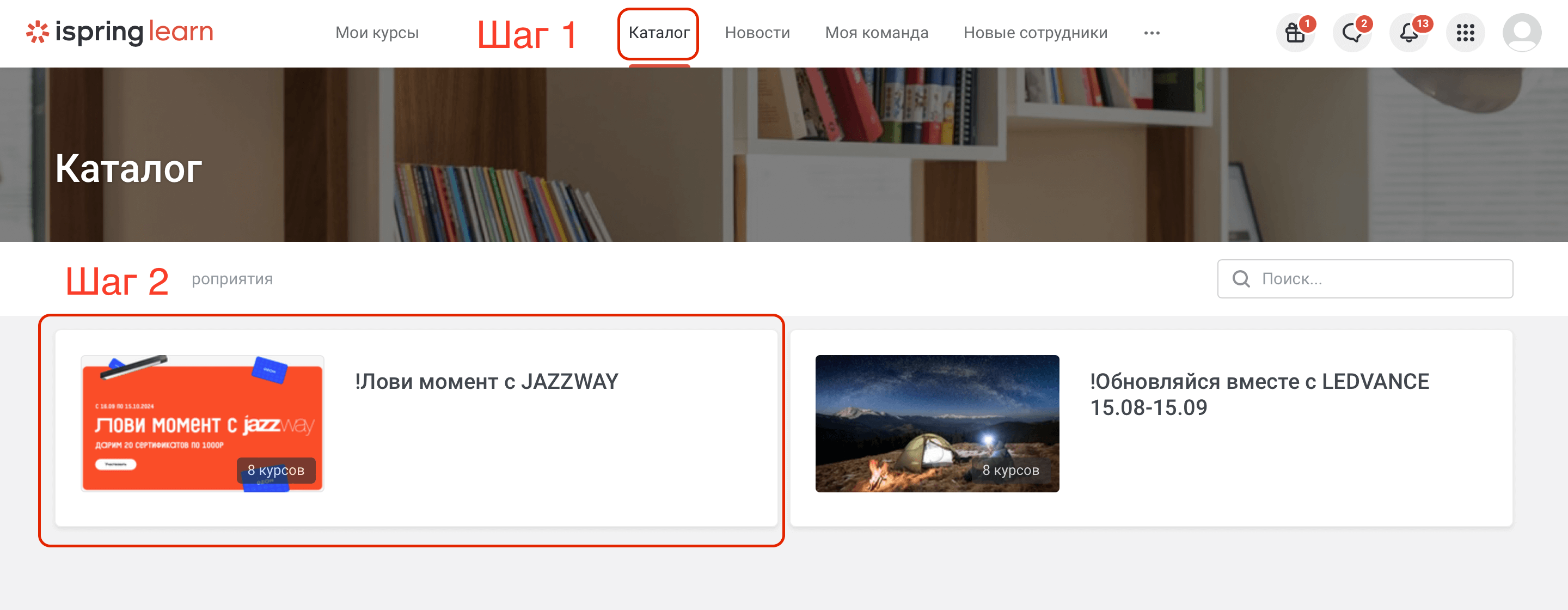 Необходимо самостоятельно назначить себе курс с пометкой "Лови момент с JAZZWAY" , это можно сделать через вкладку «Каталог».